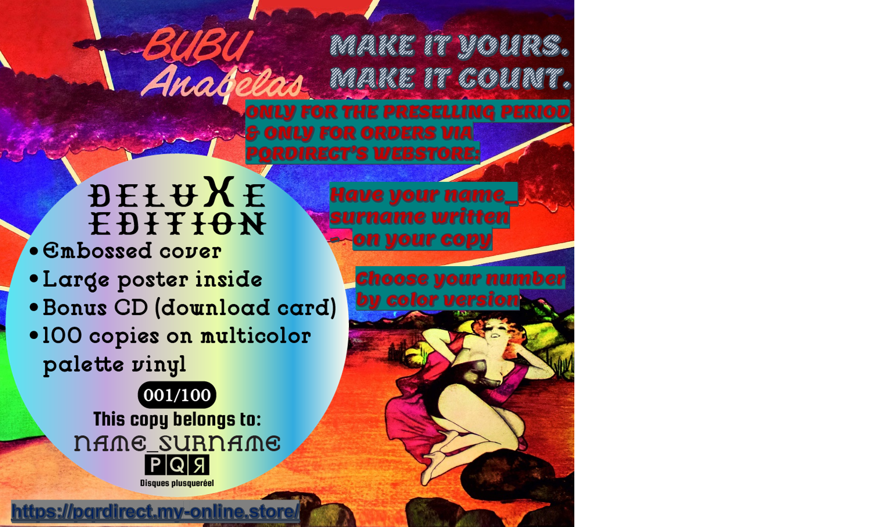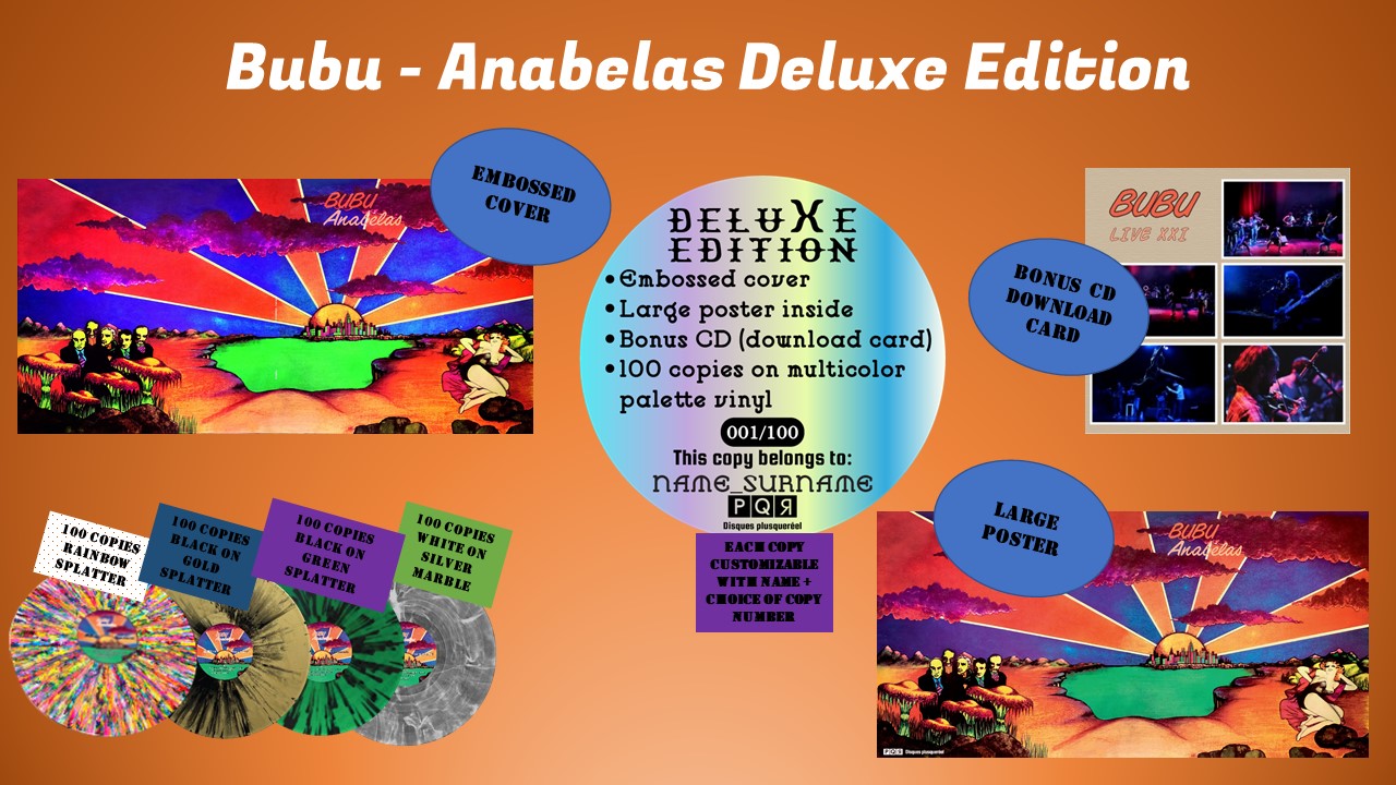 We are thrilled to announce the forthcoming deluxe edition of the Argentine prog masterpiece Anabelas by Bubu. Heralded in its contemporary 70s music press as a phenomenal release and revered globally for many years to come by progrock aficionados as a best-kept secret, this polymorphously succulent album still retains the aura of an authentic artwork. Bubu’s Anabelas beguiles the most demanding listener with its implosive amalgamation of symphonic prog with neo-classical, avant-gardisms with free jazz, brewed in a highly idiosyncratic and non-replicable fashion. This deluxe edition will appeal to demanding prog vinyl collectors, as it is available in 4 vinyl colors of 100 copies each (rainbow multicolor splatter, silver and white marble, black on green splatter, black on gold splatter), featuring an embossed front cover, a large poster, and a downloadable bonus cd. But above all else, you can make this album truly yours and make it count: exclusively during the pre-selling period (until mid-December 2025), you can select the number(s) of your choice for any of the 4x100 pressings, as well as have your name written on the sticker with the copy number.